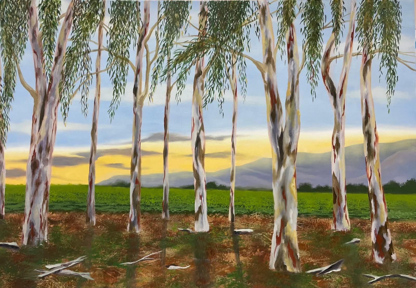 שורת אקליפטוסים גבוהה ניצבת מול הנוף הפתוח של כפר סאלד.