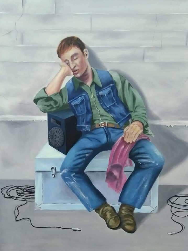 סאונדמן נשען לאחור, עיניים עצומות לרגע, באמצע יום עבודה. הכבלים פרושים, הרמקול לידו — הכול מוכן, רק הגוף מבקש הפסקה קצרה. זהו רגע יומיומי, כמעט הומוריסטי, של עייפות מוכרת מאחורי הקלעים. ציור קליל על האנשים שעושים את הרעש — וצריכים לפעמים שקט