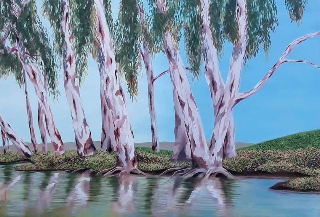 שורת אקליפטוסים בהירים ניצבת על גדות נחל הבניאס שבגליל העליון. הגזעים המתקלפים והשורשים החשופים נאחזים בקרקע הלחה, בעוד המים השקטים משקפים אותם ברכות, כמו זיכרון שנשאר קרוב לפני השטח. הירוק שסביב, הכחול הפתוח והזרימה האיטית יוצרים תחושה של יציבות לצד תנועה מתמשכת. הציור מבקש לעצור רגע במקום שבו הטבע נושם בקצב שלו
