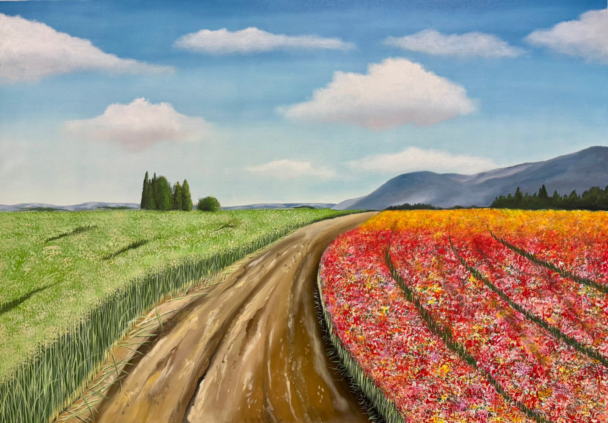 שביל אדמה חוצה את הנוף ומפריד בין שני עולמות.